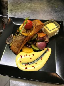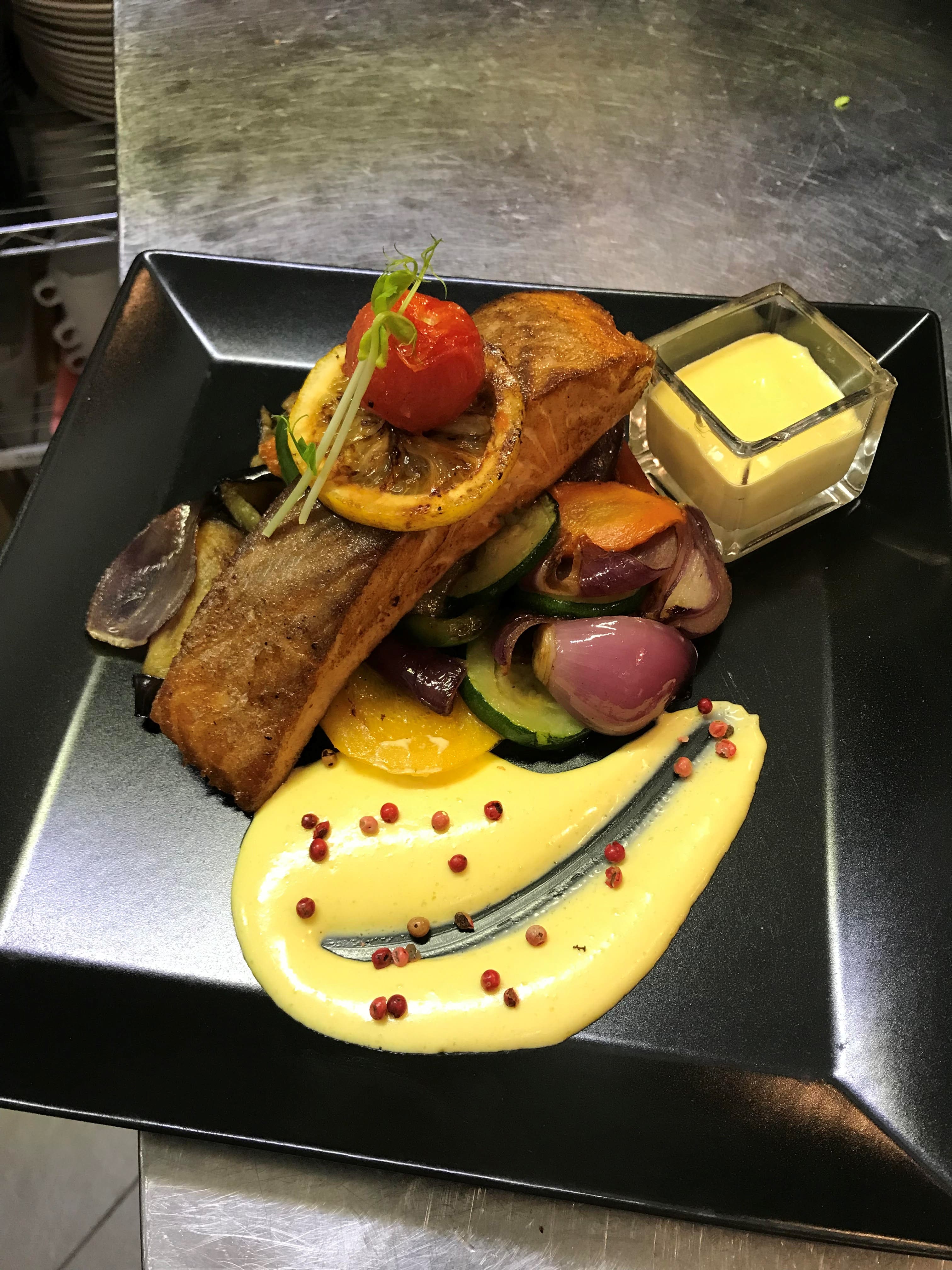 - Lazac zöldfűszeres krusztában, grillezett zöldségekkel